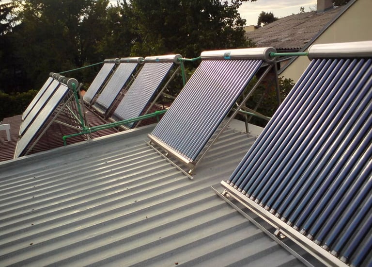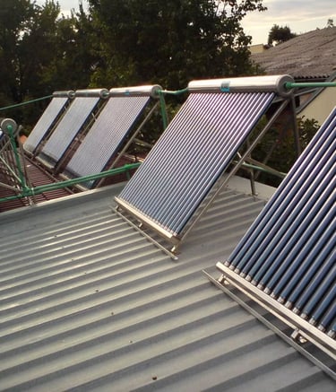 used to heat water for residential and commercial buildings whether for home usage of hot water or for heating homes or heating swimming pools.Vacuum or Evacuated Tube Sollar Collectors are connected on metal frame connected with circulating pump and tanks receiving the sun light and converted to hot water, can be installed on the roof or ground or parking garage.